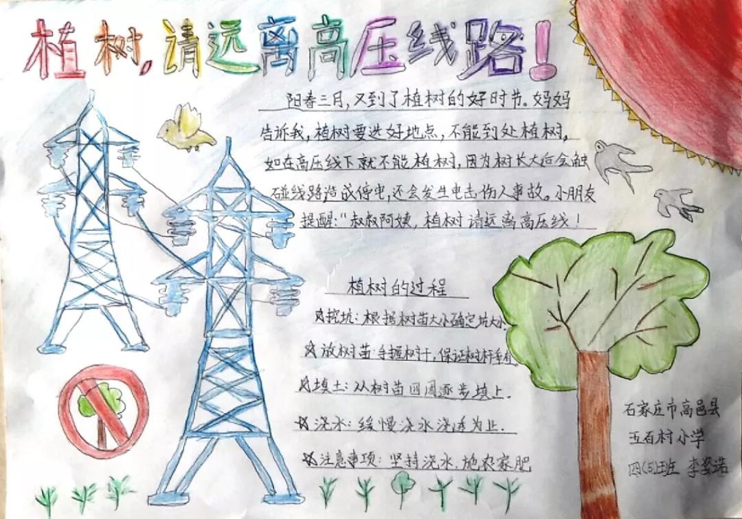 这份手抄报,出自一位叫李姿诺的四年级小学生之手。稚嫩的文字,说清了一个道理:电线下植树危险!