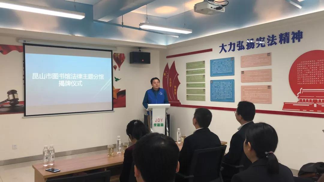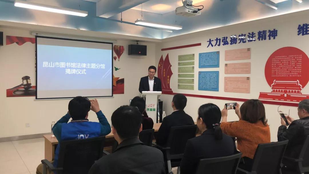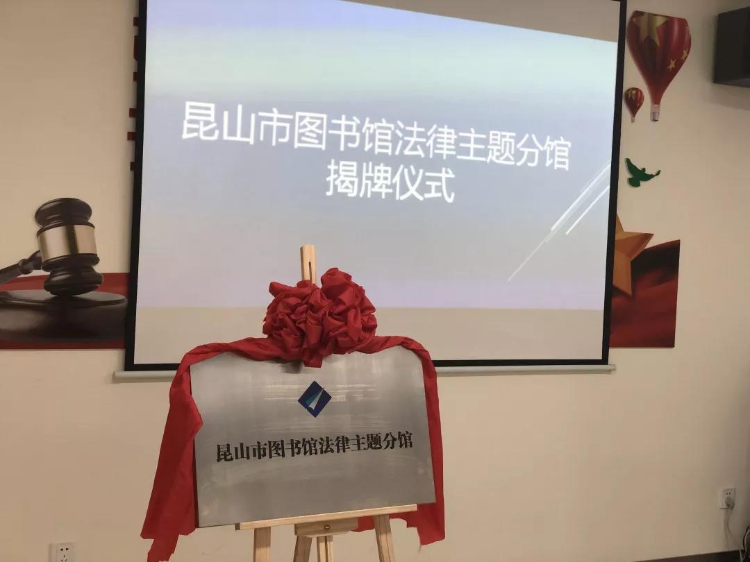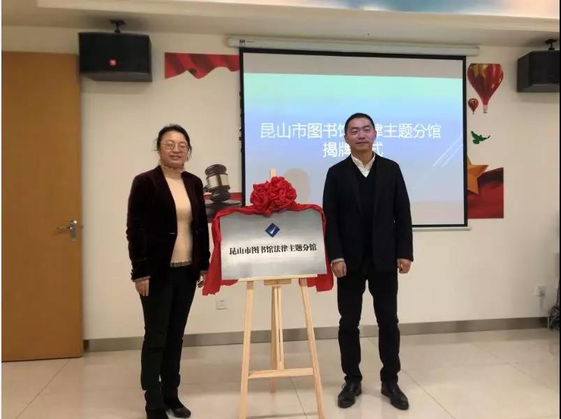 2018年12月3日下午,“昆山市图书馆法律主题分馆”揭牌仪式在昆山市乐融融服务中心总部举行,昆山市图书馆馆长金磊、昆山市司法局副局长徐超、昆山市文广新局副局长周骁共同为分馆揭牌。
